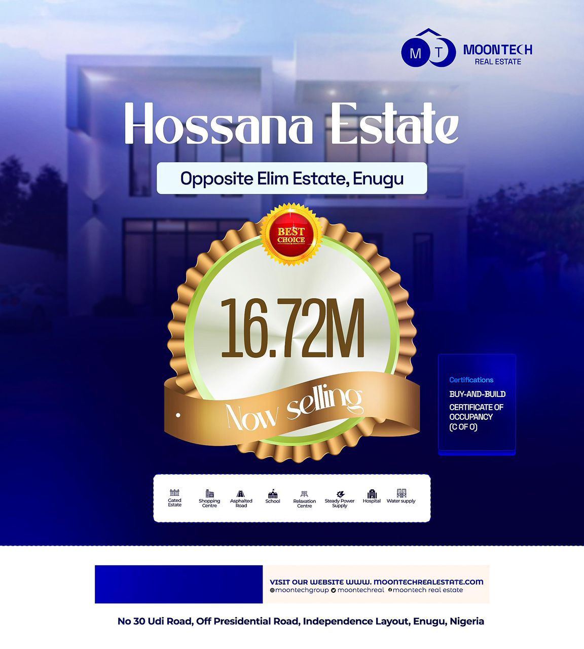 Located in the heart of Enugu’s emerging neighborhoods, Hossana is a vibrant estate layout that combines affordability with convenience. Its strategic location makes it ideal for both first-time homeowners and seasoned investors. With planned road networks, access to utilities, and a welcoming community atmosphere, Hossana offers a rare opportunity to own land in a fast-developing area of the city.
