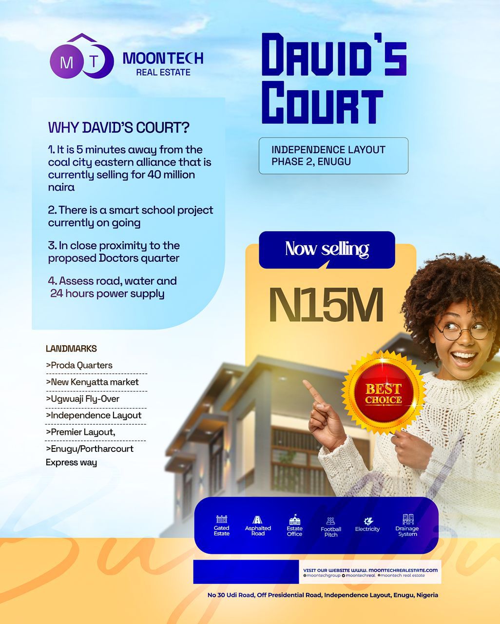 David’s Court is a thoughtfully planned residential layout in Enugu, designed to deliver comfort, accessibility, and long-term value. With well-structured plots, quality infrastructure, and close proximity to key city amenities, it offers the perfect setting for modern family living. Whether you’re looking to build a home or invest, David’s Court provides a secure and promising environment.